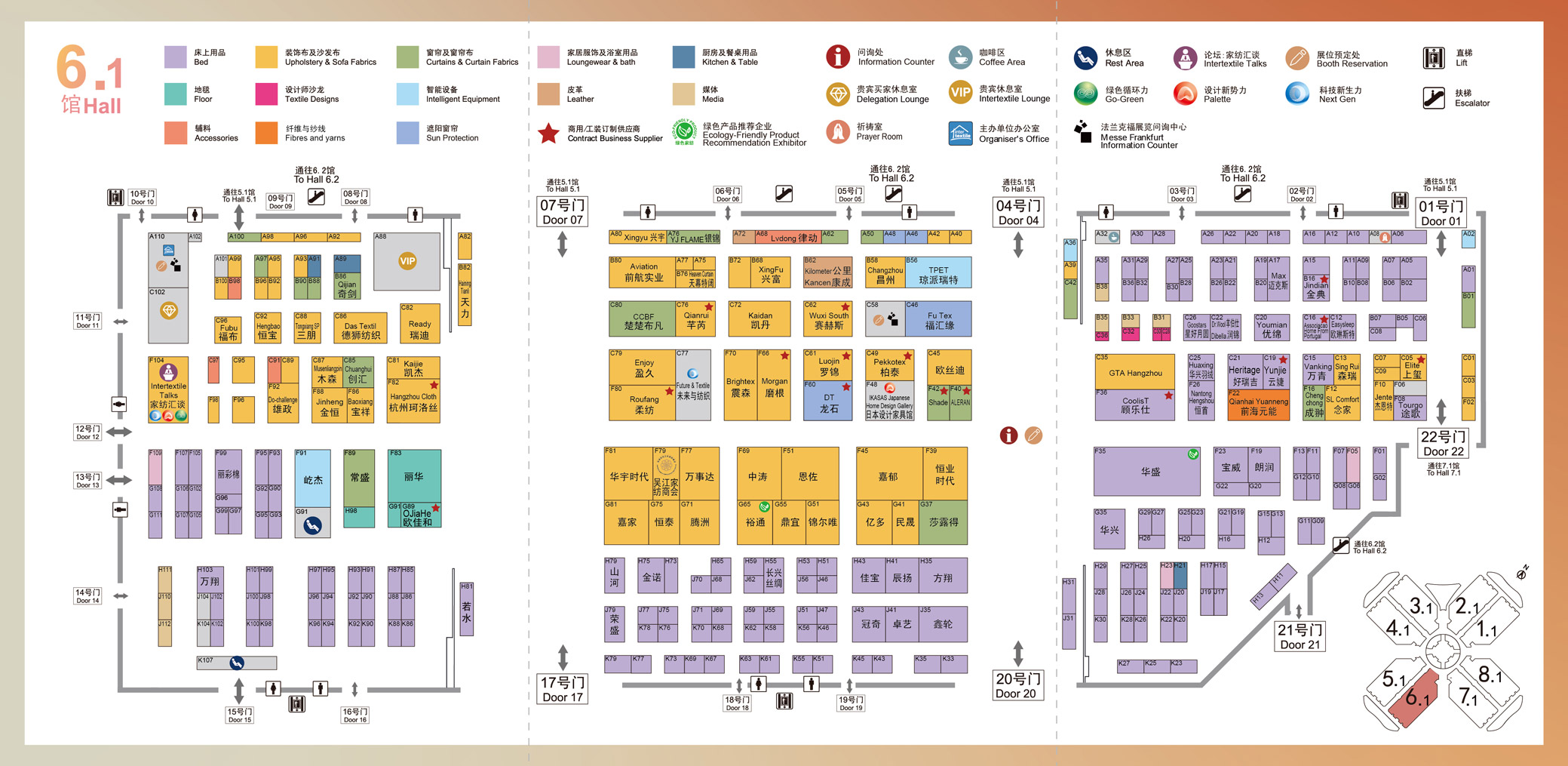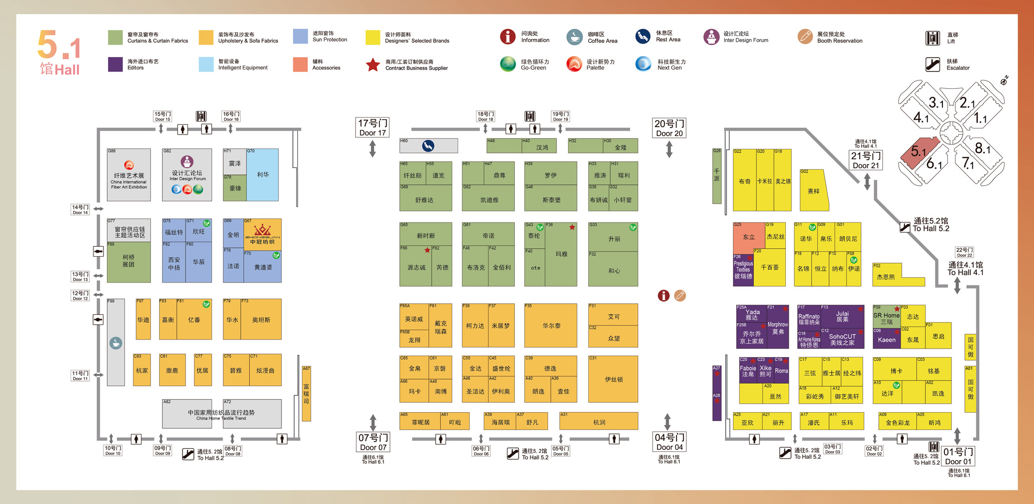 5.1号馆品牌软装馆:汇聚全球高端进口布艺、设计师面料、高端家私面料、装饰布及沙发布、窗帘及窗帘布供应链、精品窗纱、遮阳窗饰,以艺术与科技重塑家居美学边界。馆内还有三大特色展区:第七届中国国际纤维艺术展、2026/27中国家纺流行趋势、震泽丝绸杯大赛十周年纪念展。